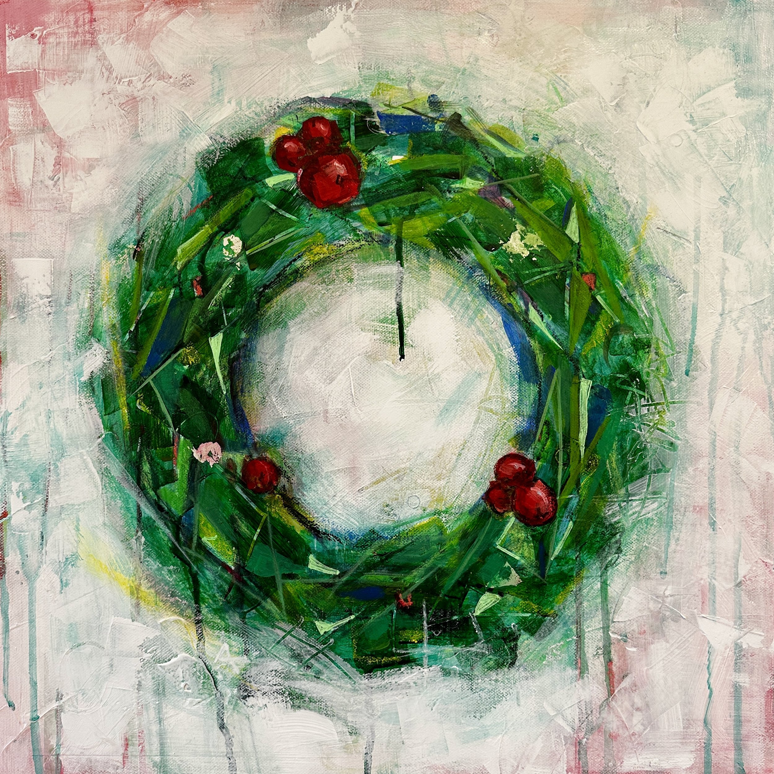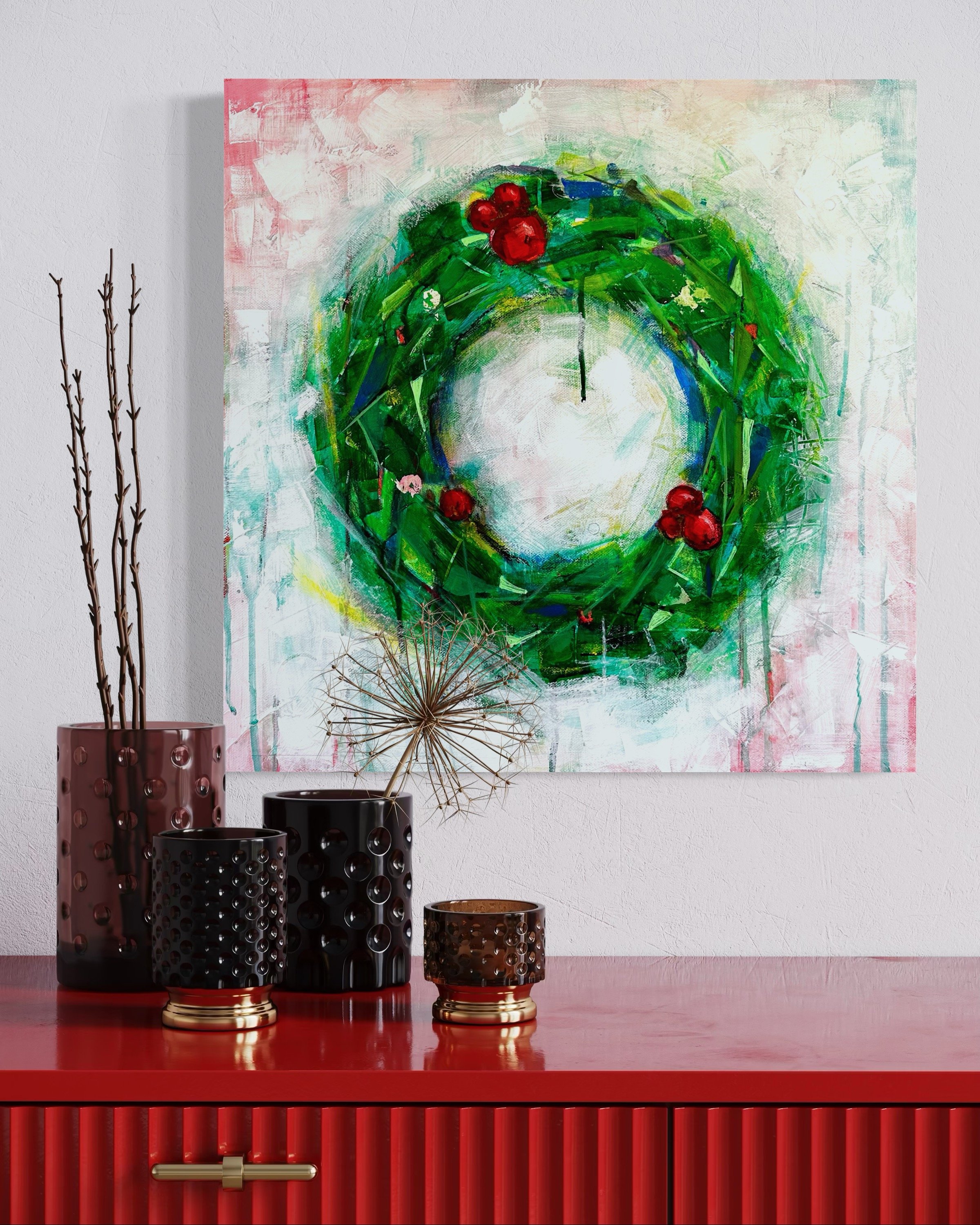 This vibrant poinsettia emerges from a field of textured whites and soft rose tones, symbolizing beauty and endurance during the winter season. Bold reds and greens dance across the canvas, capturing the poinsettia’s natural grace through abstract impressionism. A celebration of warmth and color, this piece brings festive energy and artistic sophistication to any space.